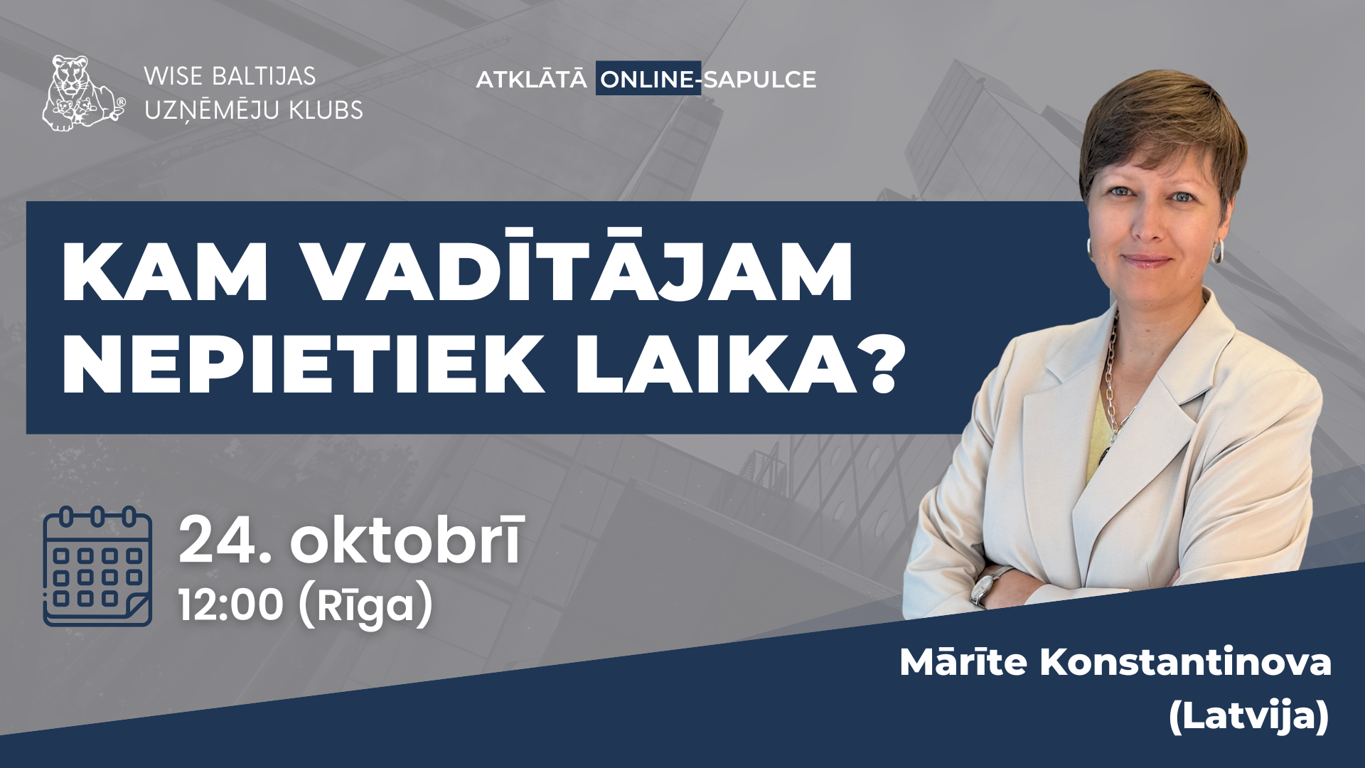 Kur paliek vadītāja laiks? Šķiet, ka strādājat visu dienu, bet: Kāpēc tā notiek — un kā to mainīt? Atbildes — vebinārā, kas notiks WISE Baltijas uzņēmēju kluba atklātās sapulces ietvaros. PASĀKUMĀ JŪS UZZINĀSIET:1. KAS PATIESĪBĀ ZOG JŪSU LAIKU UN ENERĢIJU. 2. KĀ ATGŪT ZAUDĒTO UZMANĪBU SEV UN SAVAM BIZNESAM. 3. KĀDI VADĪBAS INSTRUMENTU DOD ĀTRUS REZULTĀTUS. REĢISTRĒTIES |